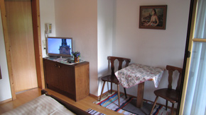 Gästezimmer mit viel Sonne im 1. Stock des grünen Hauses. Vom Balkon sieht man links den Sarstein, rechts das Ramsaugebirge und geradeaus zum Krippenstein (Dachsteingebirge). Auch hier gibt es SAT-TV mit ca. 50 Programmen und Telefon. Das Badezimmer ist mit Dusche/WC ausgestattet. Im selben Stock befindet sich eine Kochgelegenheit mit Kühlschrank. Wir vermieten die Zimmer der Etage gerne an große Gruppen oder Familien bis 9 Personen. |
